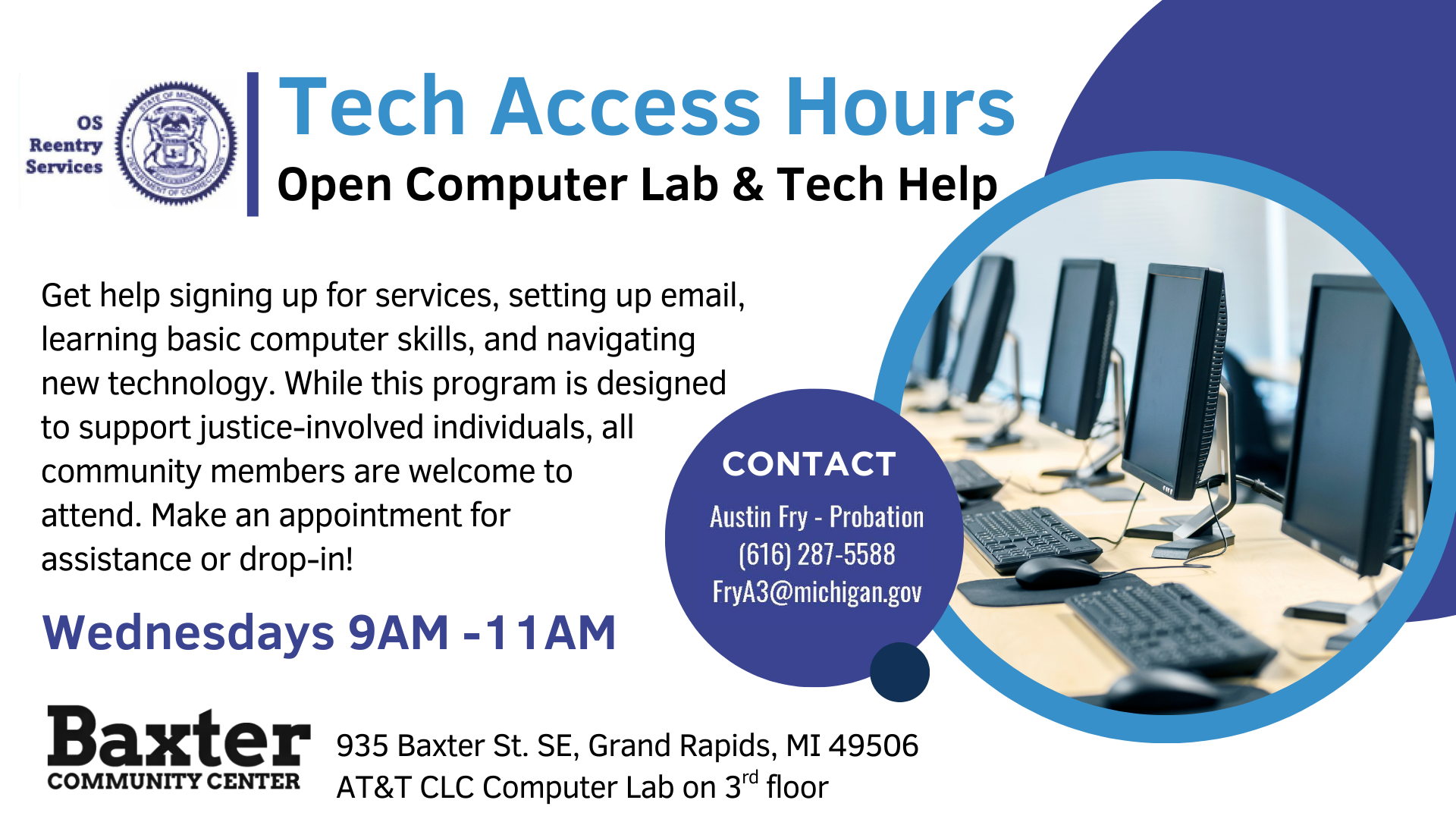 OS Reentry Services is hosting open computer lab hours to provide a supportive space for individuals to get connected. Located in Baxter Community Center’s new AT&T Connected Learning Center computer lab, Participants can receive help signing up for services, setting up email, learning basic computer skills, and navigating new technology. While this program is designed to support justice-involved individuals, all community members are welcome to attend. Contact Austin to set up an appointment for assistance or just drop in!